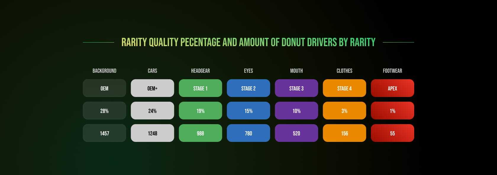 Moreover, our developers built a generator that creates NFTs according to the percentages shown below. You can see the probability and how 5024 DONUT Drivers will be minted and graded in this table: